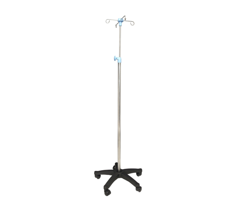 Height-adjustable IV stand designed for stable and secure support of saline and IV fluids in hospitals, clinics, and healthcare facilities.