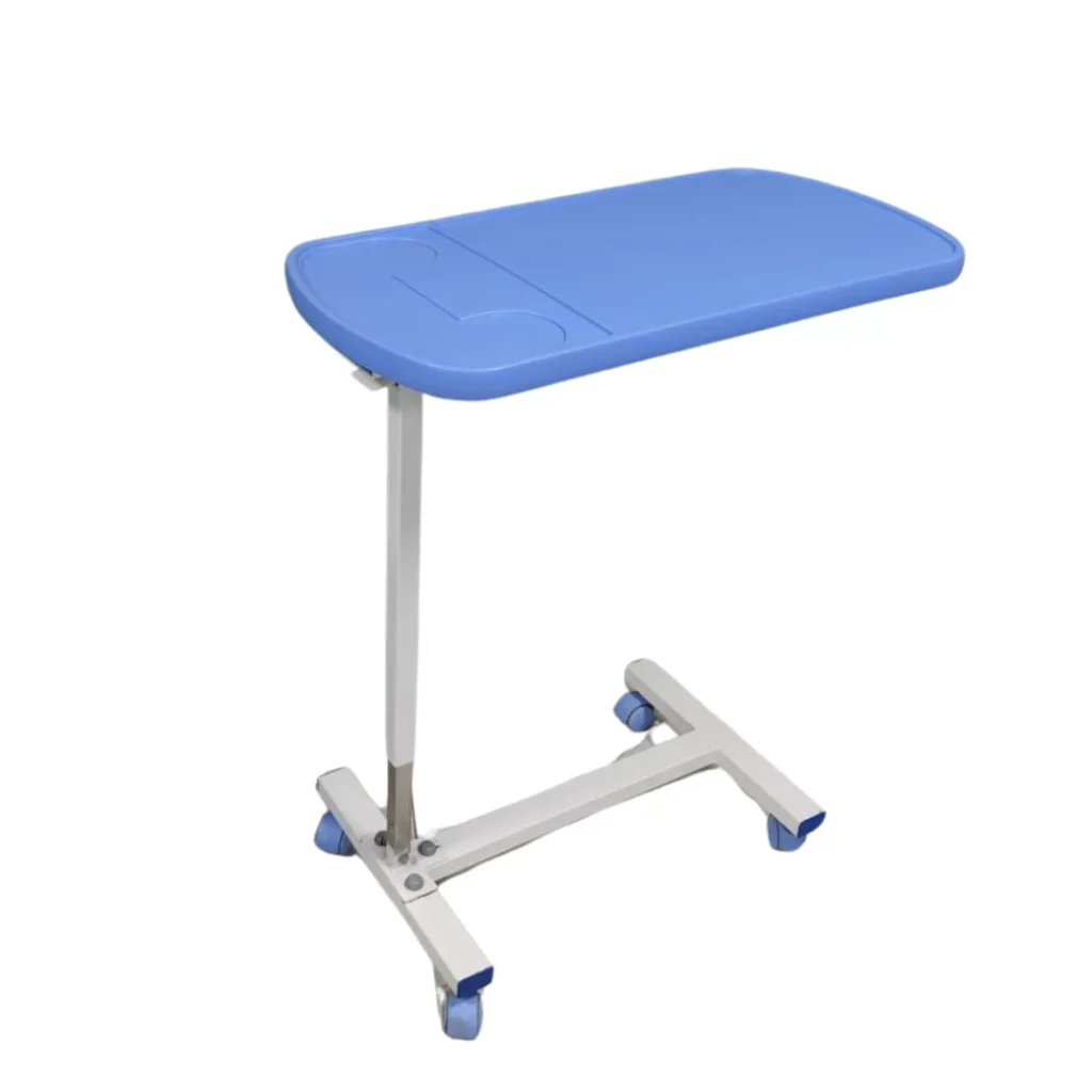 Adjustable overbed table designed for patient comfort, suitable for meals, reading, and medical use.